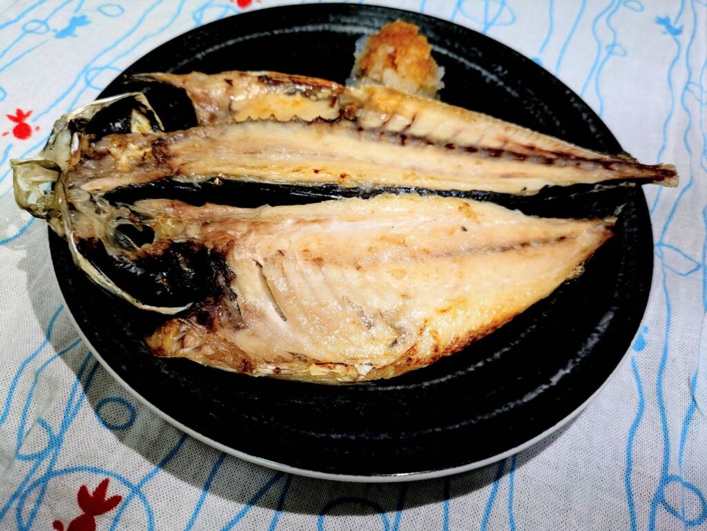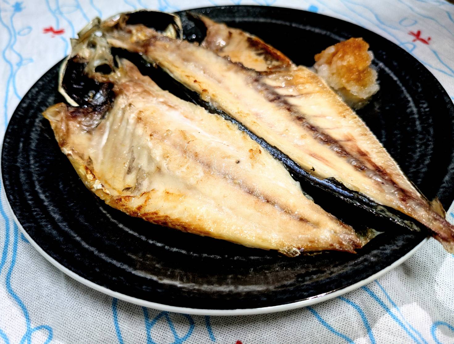 浜田市のブランド魚「どんちっちあじ」の干物をフライパンで焼きました。